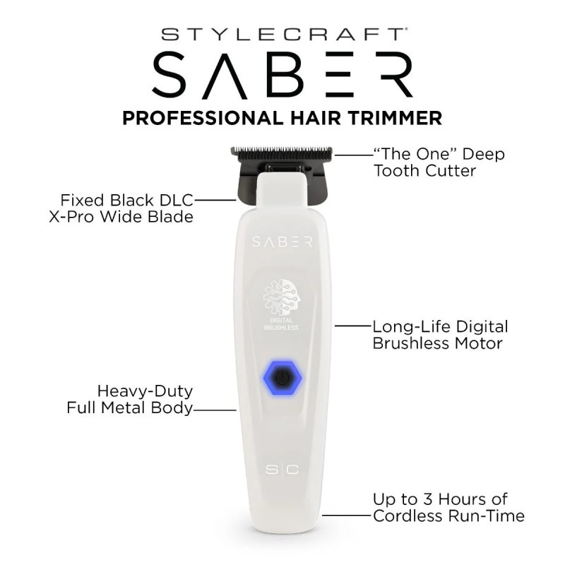 StyleCraft Saber Full Metal Body Digital Brushless Motor Cordless Trimmer White